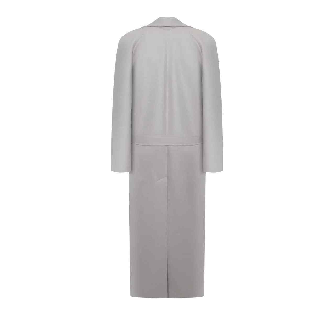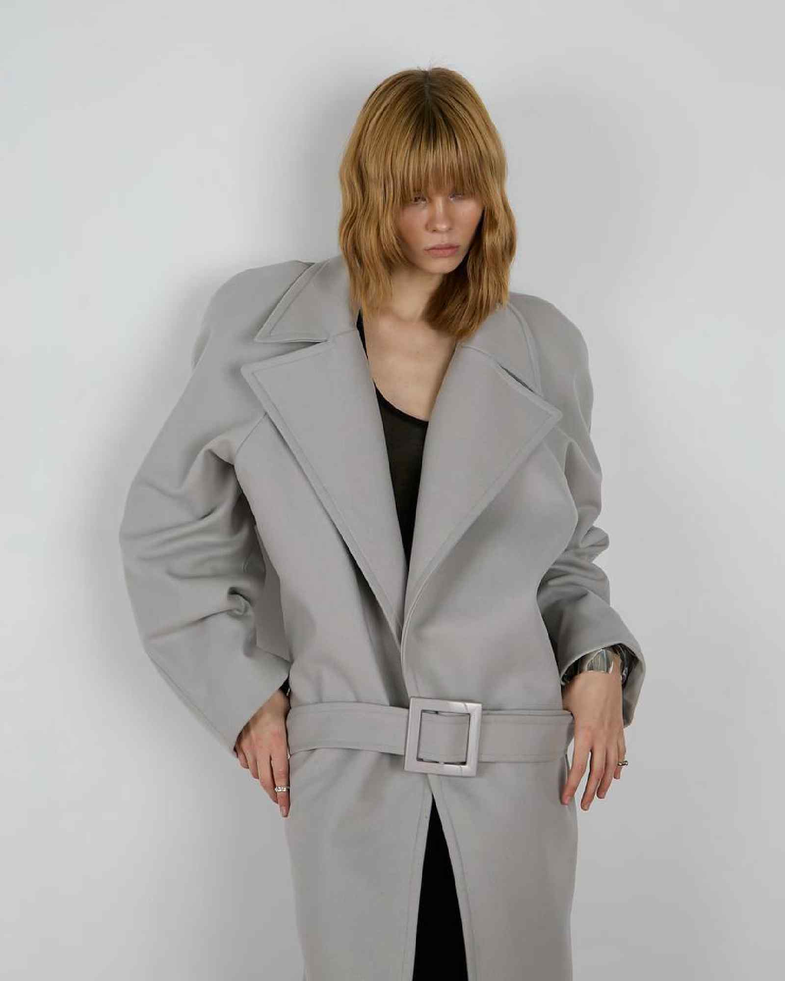 Объёмное пальто прямого кроя с акцентированными плечами реглан и мягкой линией лацканов. Силуэт строится по принципу перевёрнутого треугольника — широкие плечи переходят в свободное макси-полотно, подчеркивая хрупкость фигуры.