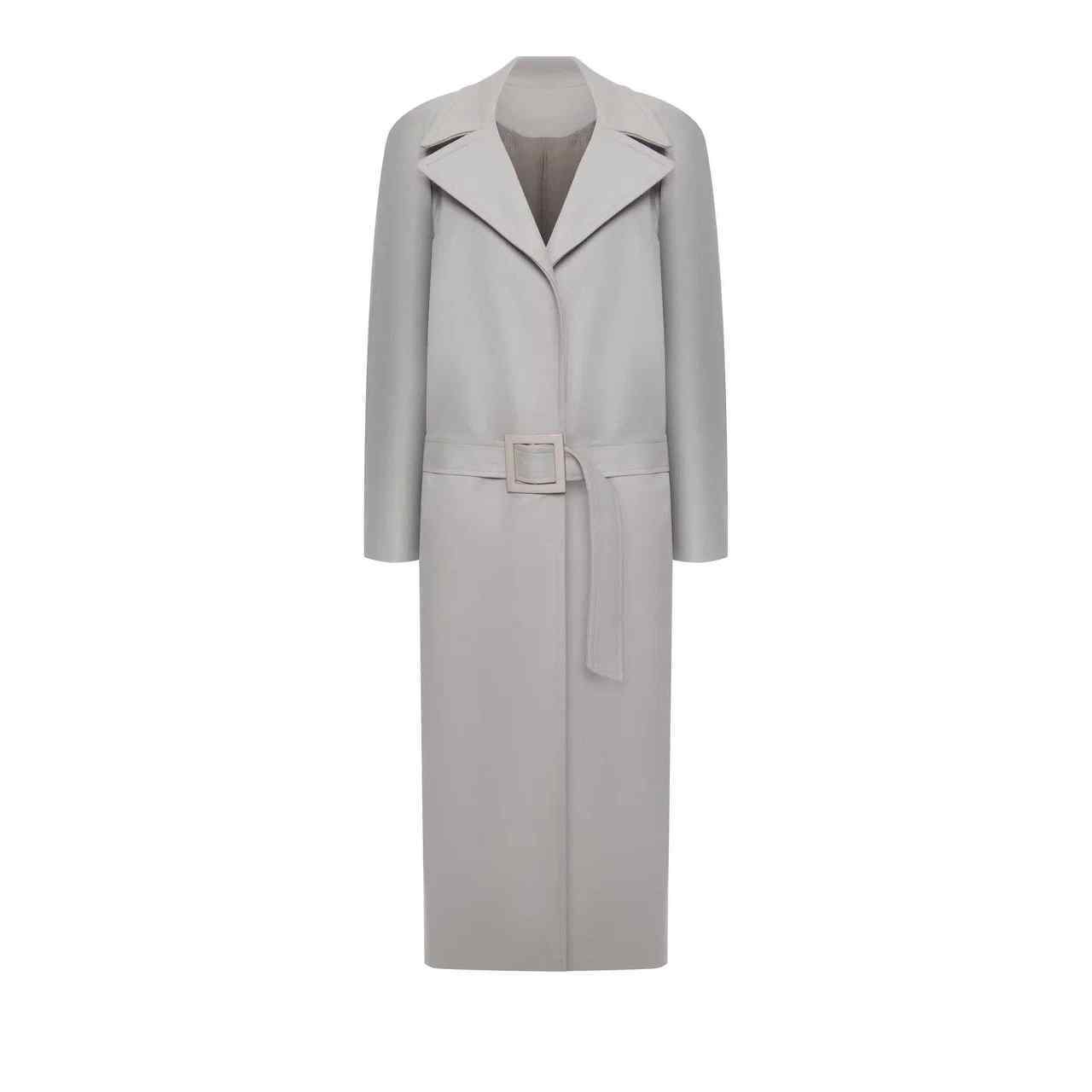 Классическое пальто из шерсти светло-серого цвета с акцентным воротом и поясом. Подойдет и для нее и для него.