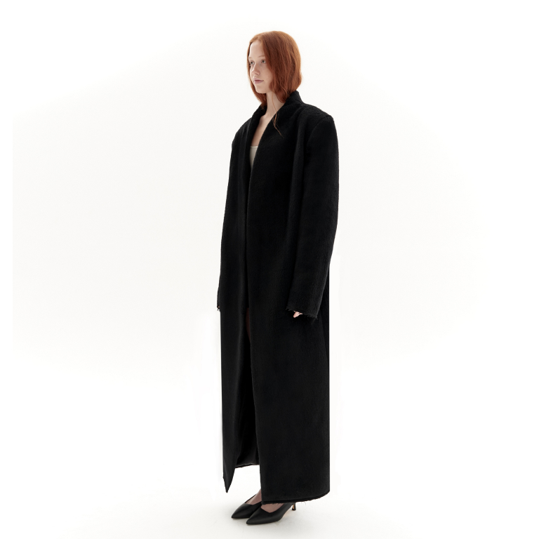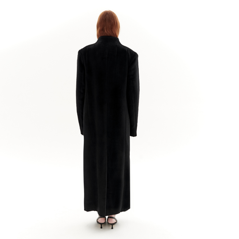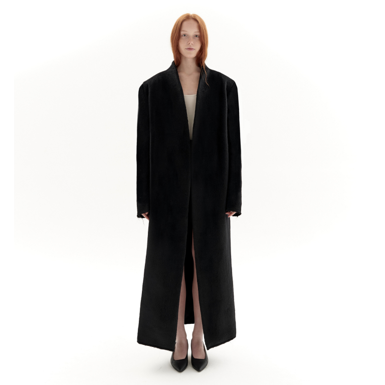 Строгое пальто из шерсти "Ангора" без лацканов с шелковистым высоким ворсом. Прямой силуэт. Два внутренних кармана. В комплекте плоский тонкий пояс.