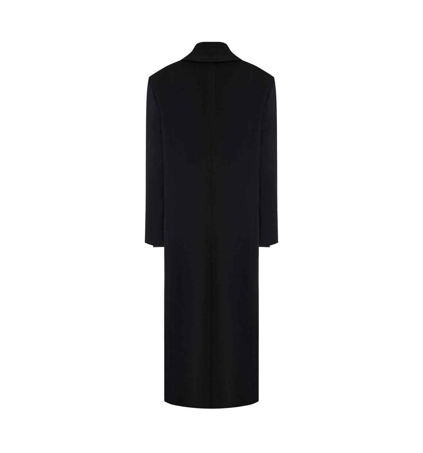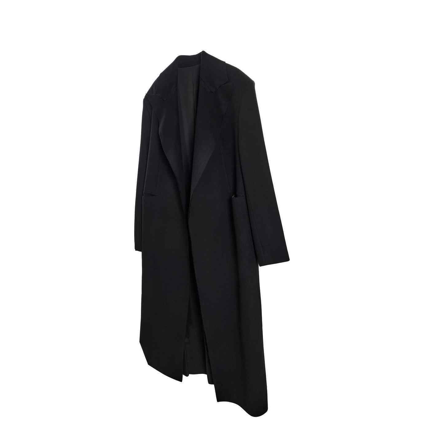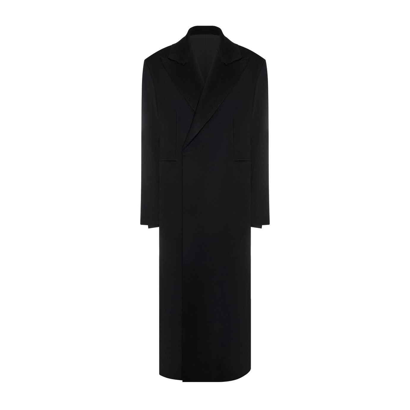 Длинное пальто прямого силуэта с открытыми лацканами и необработанными краями. Изготовлено из шерстяного полотна с добавлением кашемира (60% шерсть, 40% кашемир), что создаёт баланс между структурой и мягкостью. Длина 140 см подчёркивает вытянутый силуэт и архитектурность формы.